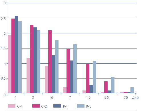 Примечание: * — межгрупповая достоверность различий р < 0,05 по соответствующим дням обследования, ** — достоверность различий р < 0,01 по отношению к исходным данным в этой же группе. Условные обозначения см. в тексте.